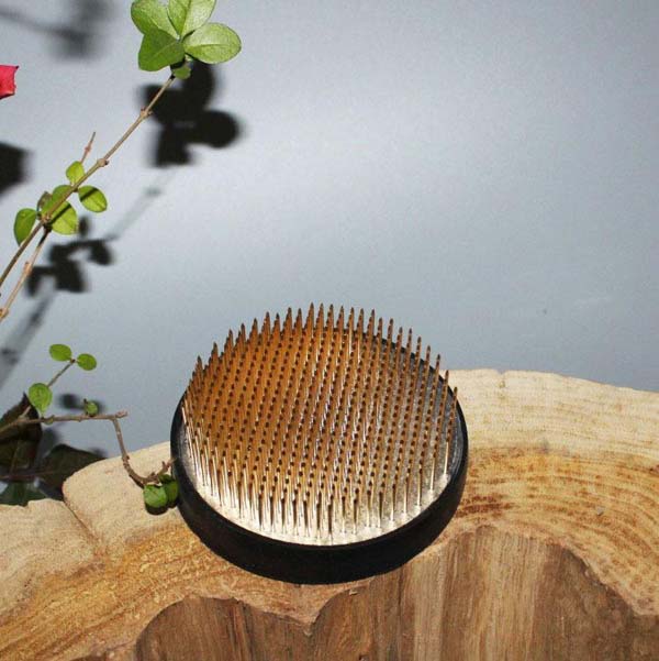 现在插花用的剑山是将铜针或不锈钢针固定在不同形状的铅块上,大小形状各不相同,适合放在不同的容器中使用。剑山的下部有橡皮圈,是为保护花器而增加的。