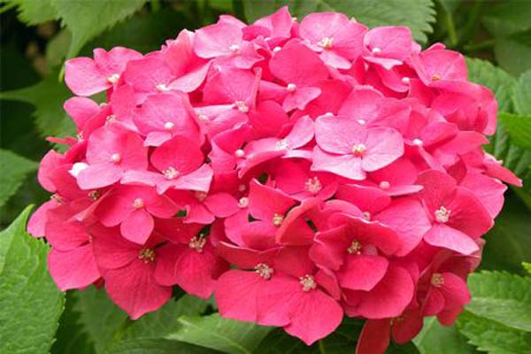 叶片深绿色,花色鲜红,若生长在pH值在5以下的土壤中,花会变成深蓝色。