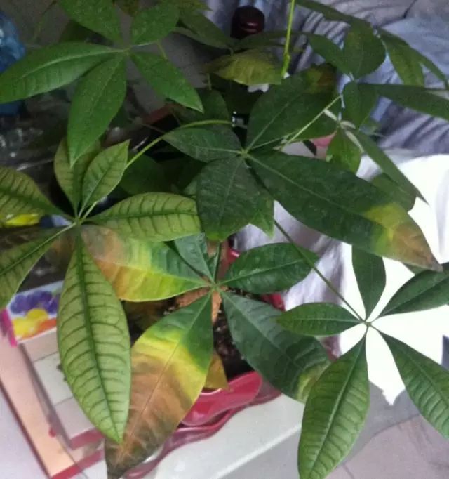 很少会有发财树是因为少水而导致叶黄,除非你看到底端的叶片焦黄、脱落,那样才是缺水。