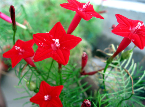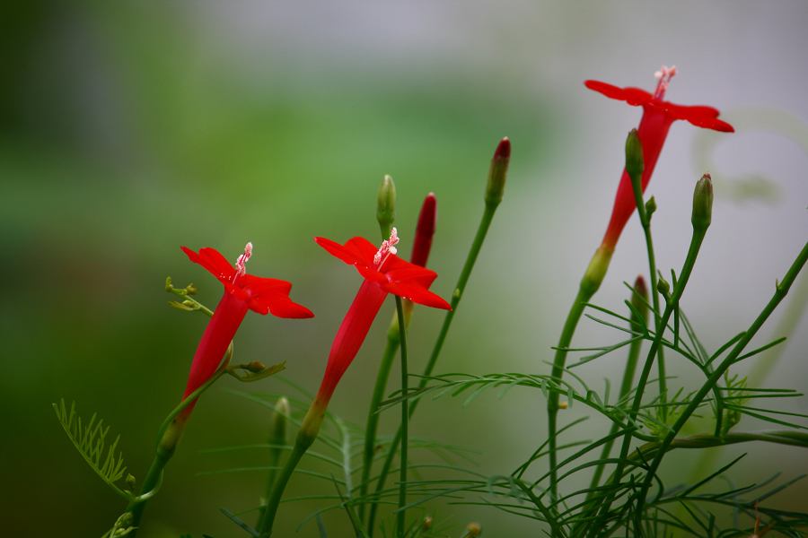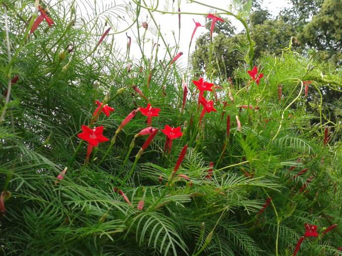 茑萝看上去柔柔弱弱的,通常是盘绕生长发育的。枝干苗条,叶片卵形,叶的裂片长细如丝,呈羽毛状。盛开较小,五角星状,色调深红,犹如星光点点,别有风味。花开后会结种子。