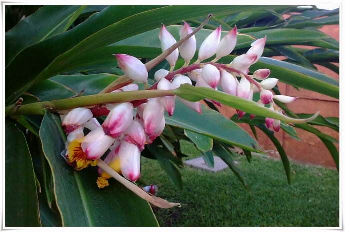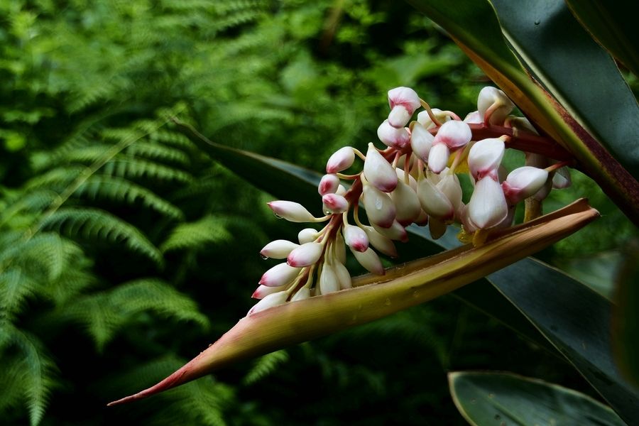 艳山姜的花序成锥体状,松驰感显著。花瓣展现乳白色,顶部为淡粉色。