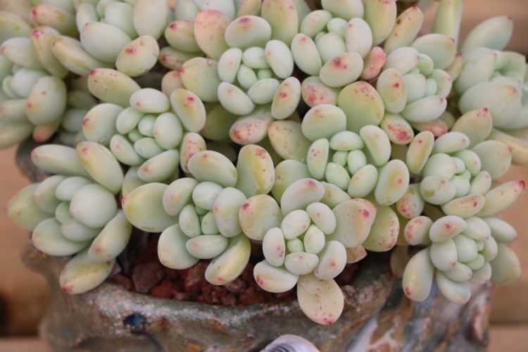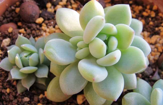 在阳光照射充裕、温度差大的状况下,叶尖会出現小红点,叶色变成淡绿色或浅绿色,宛如凝冻透亮、弹吹欲破的玉脂,从而而出名凝脂莲。