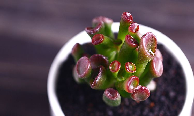筒叶花月的横截面很像马蹄,因此称为马蹄角,太阳光晒过以后,叶子会展现鲜红色,因此也叫马蹄红。它的全部造型设计看上去很是好看,叶型新奇,色调靓丽,很合适做室内盆栽养植,以观叶为主。