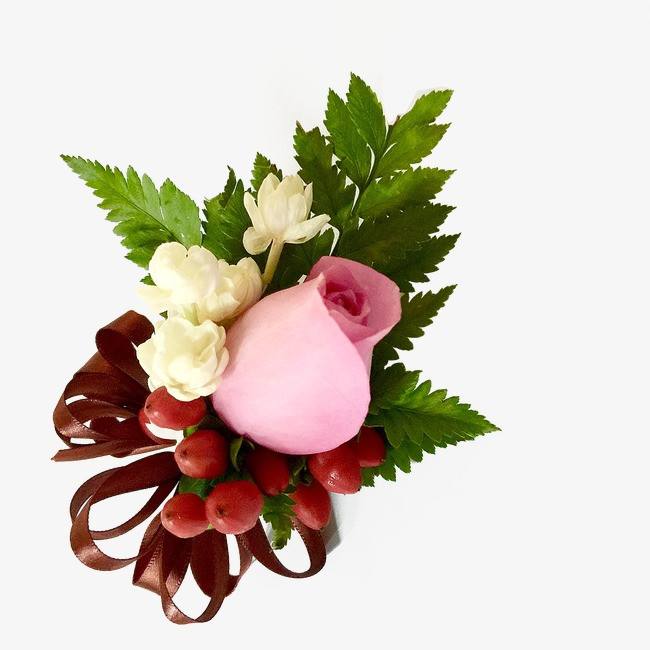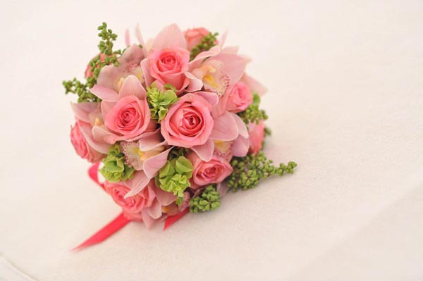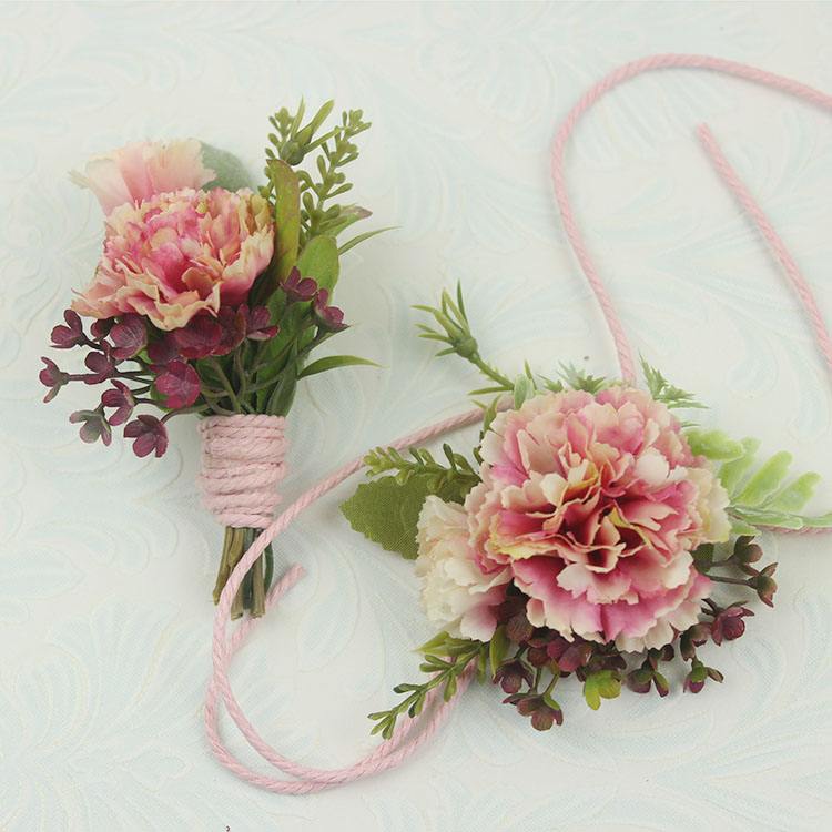 新人母亲的胸花搭配不仅显得非常的贴心,也能显示出他们的特殊身份,对于尊贵的女宾(如祖母)也是可以做这样的考虑的。花材的选择不一定要完全一样,可以选择母亲喜爱的、而且和婚礼配色一致的,但是配饰上需要与婚礼的其他装饰相协调。胸花一般是佩戴在左侧的,但是佩戴胸花可能会让衣服留下针眼,所以如果客人的衣服十分昂贵可以选择搭配手包花或是手腕花。为了握手和拿酒杯时能更好的展示手腕花,一般都佩戴在右手。花材也一定要跟手捧花和钮孔花相配。
