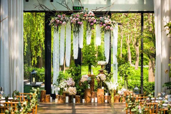 森林系婚礼花艺崇尚自然,以白色、绿色为主色调,夸张地运用了大量植物、花朵、树本等的自然元素,花艺设计完美融入环境,逼真又高明。森女控、文艺范儿的姑娘们一定不能错过一场专为你而生的森林系婚礼。