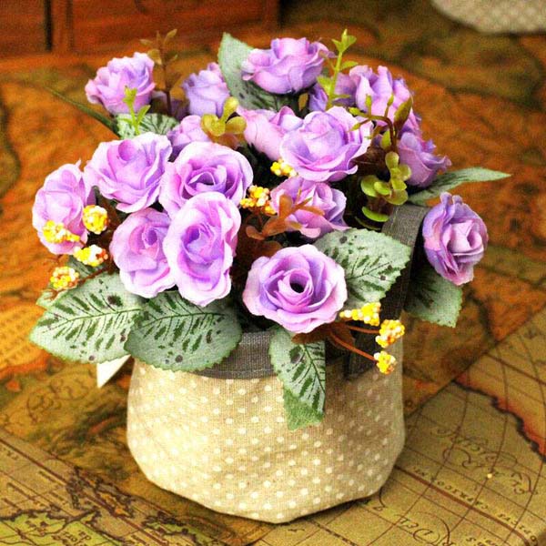 所用花材是人工仿制的各种植物材料,包括绢花、涤纶花等,有仿真性的,也有随意设计和着色的,种类繁多。人造花多色彩艳丽,变化丰富,易于造型,便于清洁,可较长时间摆放。