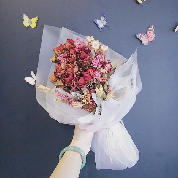 全部或主要用自然的干花或经过加工处理的干燥植物材料进行插制。既不失原有植物的自然形态美,又可随意染色、组合,