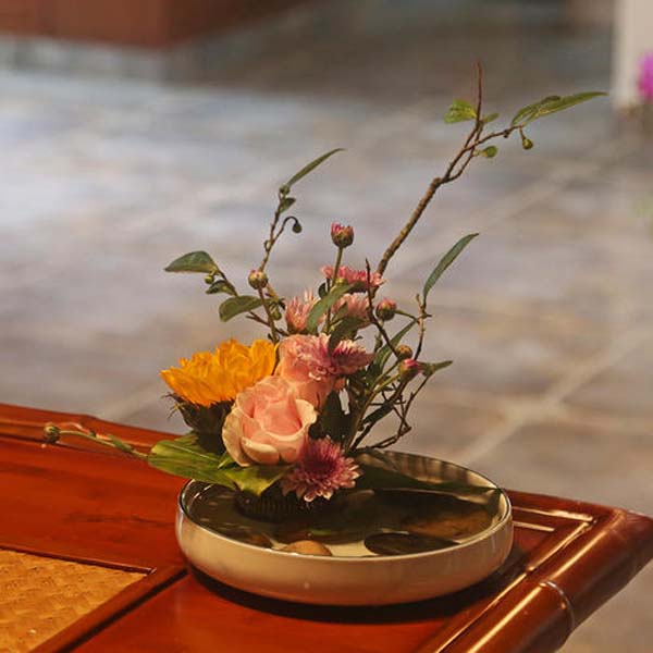 盆式插花 又称盆花,即利用水盆进行插花,或利用其他类似于水盆的浅口器皿进行插花,由于容器较浅,需要借助花砧、泡沫、卵石等固定物才能完成作品,与瓶花相比,盛花的难度较大,需先造型,然后再根据造型,安插花枝和配 叶。