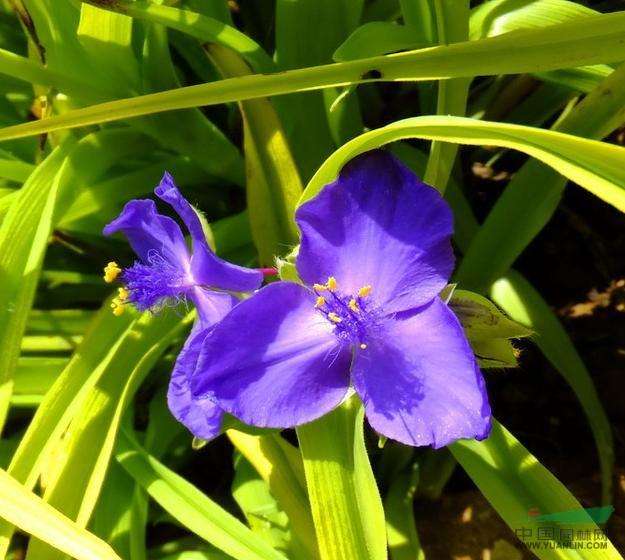 金叶紫露草是蓝花紫露草变异品种,生性强健,耐寒,在华北地区可露地越冬。花期是4至11月,花径直立,节明显,株形奇特秀美,花色蓝紫,三片花瓣托出毛绒绒的雄蕊,分外俏丽。