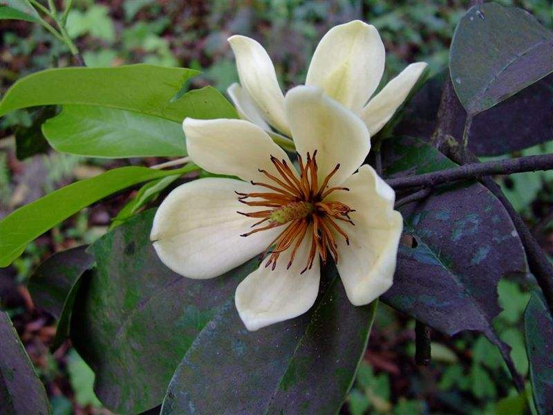 深山含笑,整体植株体表无毛;树皮较薄,呈现浅灰色和灰褐色。叶片为椭圆或长圆形,具有光泽,呈油绿色。花朵的基部略显淡红色,花瓣纯白。其花期为2——3月份,果期为9——10月份。