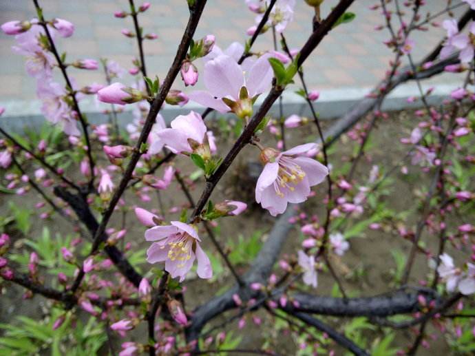 开粉红色或者粉白色的花朵,单瓣,花朵比较小,花萼、花瓣均为5片,与野生的榆叶梅相似,小枝呈红褐色。