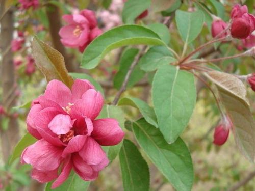 是我国培育的榆叶梅的新品种,叶色紫红鲜艳,花朵重瓣,花大多是粉色的,是大花重瓣榆叶梅的最新品种。