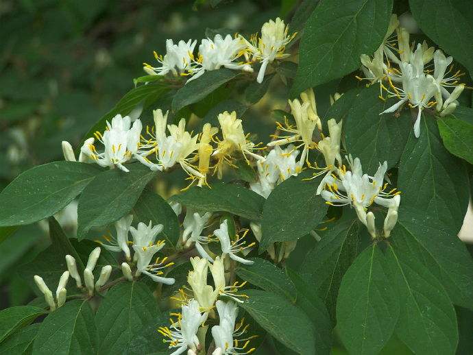 景观用途: 金银木花果并美,具有较高的观赏价值。春天可赏花闻香,秋天可观红果累累。春末夏初层层开花,金银相映,远望整个植株如同一个美丽的大花球。花朵清雅芳香,引来蜂飞蝶绕,因而金银木又是优良的蜜源树种。金秋时节,对对红果挂满枝条,煞是惹人喜爱,也为鸟儿提供了美食。在园林中,常将金银木丛植于草坪、山坡、林缘、路边或点缀于建筑周围,观花赏果两相宜。金银木树势旺盛,枝叶丰满,初夏开花有芳香,秋季红果缀枝头,是良好之观赏灌木。