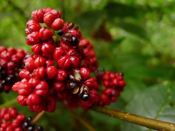 山茱萸的核果长椭圆形,长1.2-1.7厘米,直径5-7毫米,颜色是红色或紫红色。果实饱满,看起来就像一颗颗大红枣一样,鲜艳富有光泽,山茱萸的果期在9-10月。