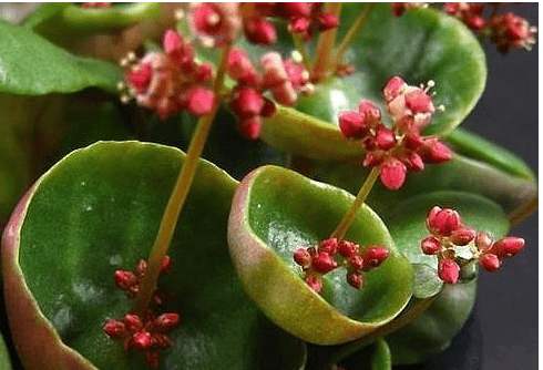 下图这种像小酒杯一样的植物,也是多肉大军的一种,名字叫小酒杯Crassula umbella 'Wine Cup',景天科青锁龙属的萌肉体,酒杯一样是它的肉质叶,如莲叶般边缘向上卷曲成酒杯模样,红色花朵串生在叶片中央,非常猎奇。