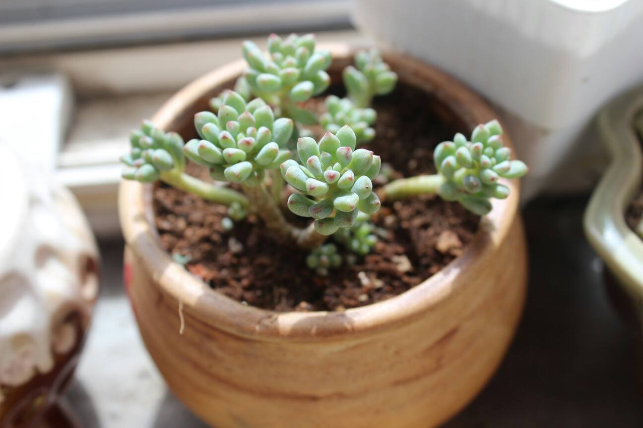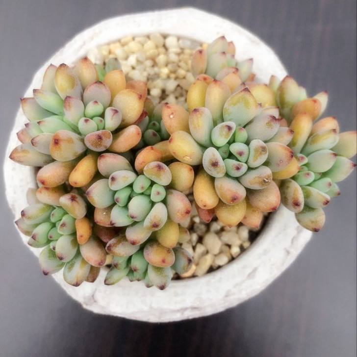 蓝豆的叶片是长圆形的,先端会有小尖,叶子上有白粉。在光照较强或者昼夜温差较大的时候,蓝豆是漂亮的蓝白色,叶尖部位是红褐色,株型较小。
