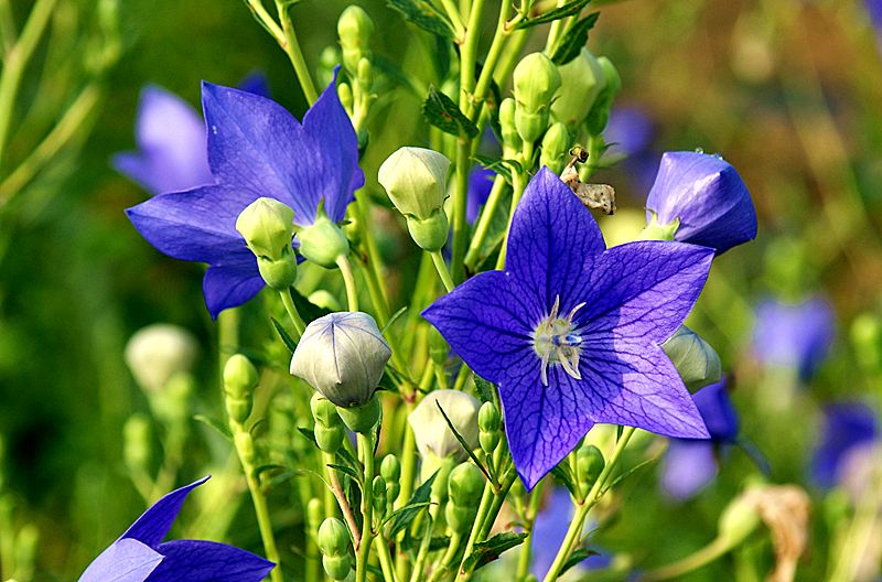 桔梗花一般生长在阳光充足的草丛、灌丛中,要是桔梗花在春季播种,则六月会开花,秋季播种,则会在第二年开花。因此它的花期还是比较长的,有四个月之久。桔梗花的花色是蓝紫色,它的花状像是悬钟,是一种很好的布景植物。