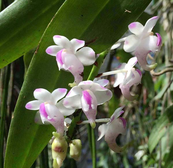 多花指甲兰顾名思义是一簇上会开很多朵花,这种指甲兰的茎比较粗壮,一般是5-20厘米左右,花苞的片是绿色的,花朵是白色的,并且带有紫色的斑点,多花指甲兰的花梗和子房晕染着淡淡的紫色。
