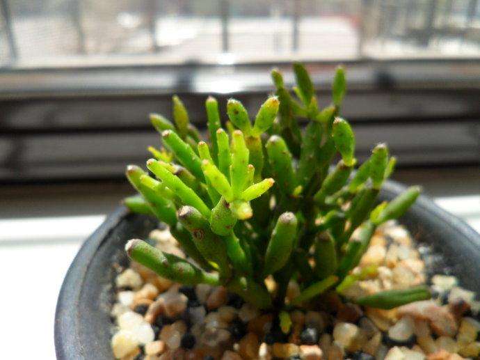 假昙花之中很独特的一种,其植株是直立生长的,枝条呈二分叉长势,茎节表面是灰色或着是暗绿色的,呈圆筒形状,没有棱。