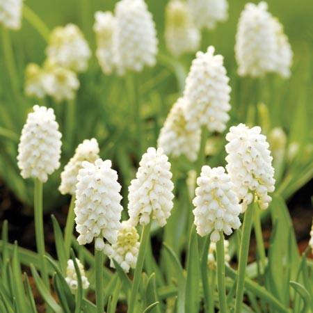 白葡萄风信子是白花系品种,株型相对矮小,开白色的小花,开花十分密集,生成葡萄串状,并且十分芳香。
