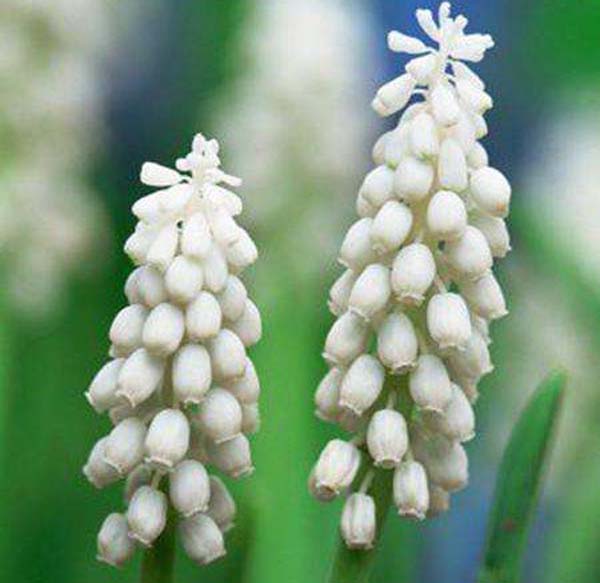 白美人葡萄风信子属于白色系品种,与白葡萄风信子不同的是叶片呈条形且肉质,开花时呈纯白色葡萄状的小花,花朵也是密生成串,与其深绿色的花杆与绿叶形成鲜明对比。