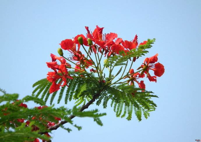 凤凰木什么时候开花 凤凰木的花期其实稍微长一点,不过它主要就是集中在夏季的时候开花,一般是在5月份——7月份之间开花,此时开花比较旺盛。 凤凰木的开花形态 凤凰木开花花美色艳,并且开花的量很大,整个树木都被染上了一片红色。 凤凰木的花型比较大,花朵腋生,有着5枚花瓣,开始时是鲜红色的,随着花朵的开放会逐渐的变成橙红色,花瓣的边缘是黄色的,并且带有褶皱。