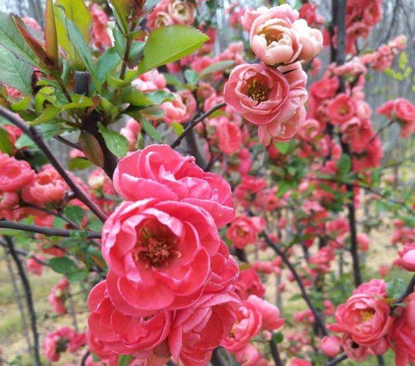 5、重瓣贴梗海棠:花色为红色,花朵重瓣,是贴梗海棠的栽培品种。