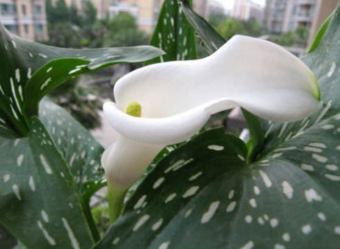 银星马蹄莲产于南非。银星马蹄莲叶片大,具有白色斑点,佛焰苞大形,白色或者浅黄色,和其它马蹄莲的区别在于银星马蹄莲的基部具有紫红色斑。银星马蹄莲的花语是忠贞不渝,永结同心。银星马蹄莲清雅而美丽,适合送给心爱的人。