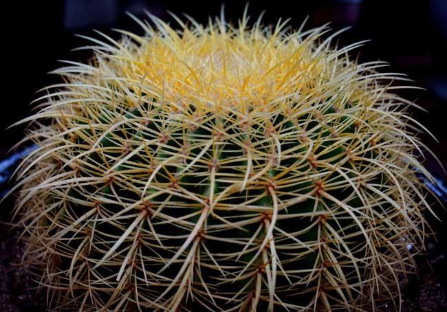 黄刺金琥的硬刺是金黄色的,更为坚硬且,要比白刺金琥的长,而且整个外表背一层金黄色的短毛覆盖,它属于野生品种,较为稀有。