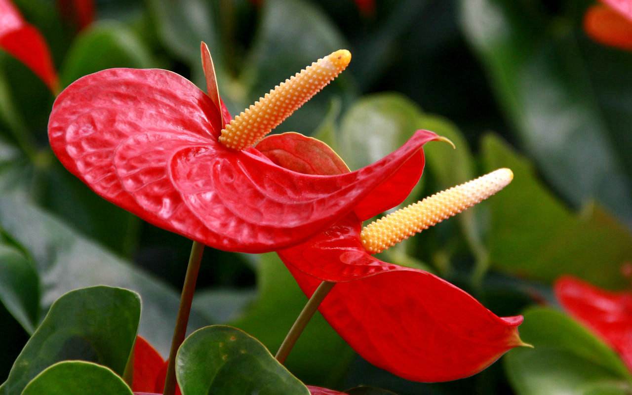 红掌的花穗整个都是黄色的,而包裹花穗的苞片则是平出,表面富有光泽,苞片的颜色有两种,一种是猩红色,一种是橙红色。这也是区别两种植物的关键。