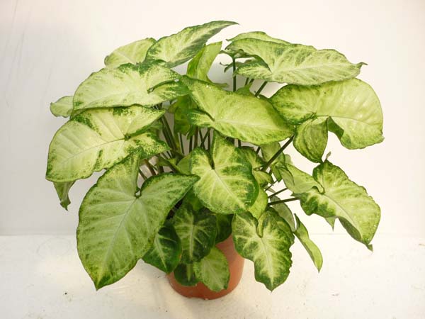 合果芋的幼叶与老叶不同,换句话说,是具有两型性叶片。新叶形状像箭或戟,其颜色较淡,常为浅绿色。而老叶则叶片呈掌形或盾形,有些品种还有呈蝶翅形的。其叶片比较厚,呈深绿色。叶脉颜色比周围叶肉颜色浅,常呈黄白色,也就导致了整个叶片的颜色是不均一的。不同种类的合果芋,其叶片形状也比较多变。