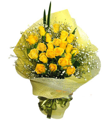 22朵黄玫瑰,搭配满天星,浅黄色皱纹纸单面包装,纱网外围。